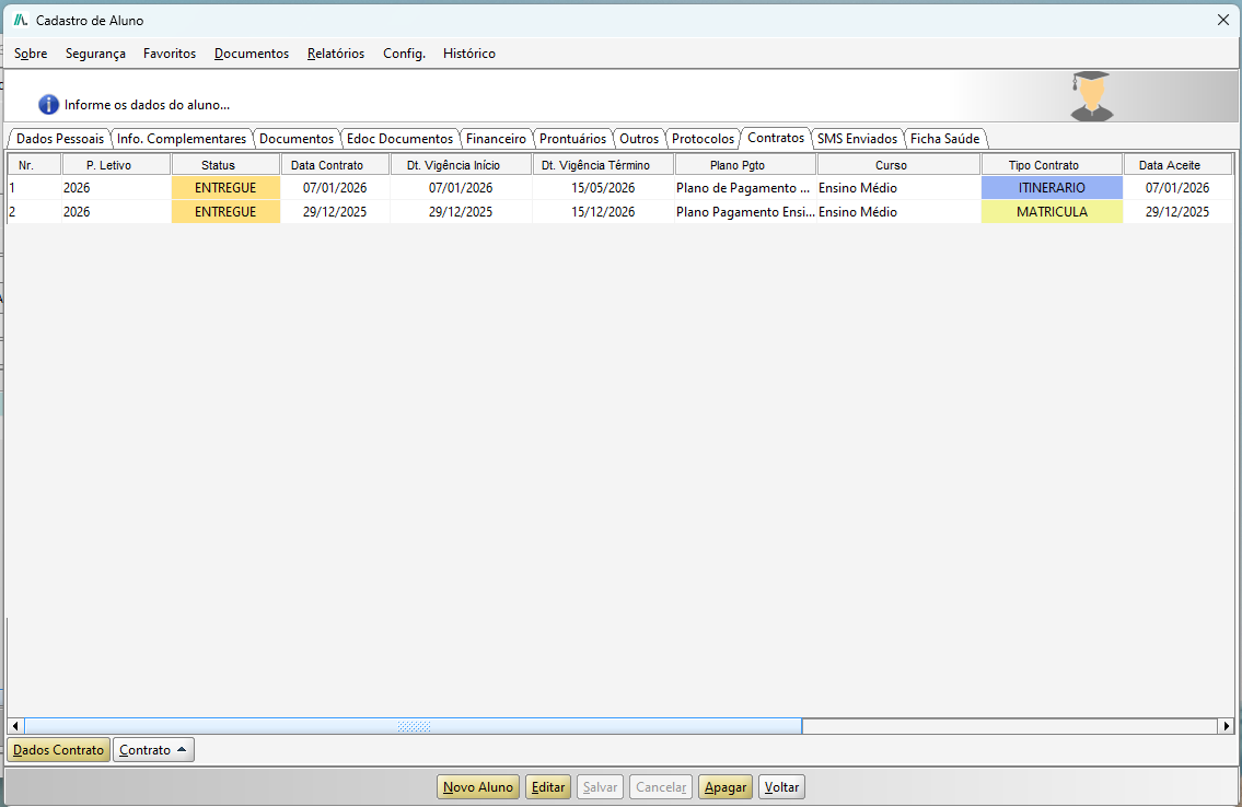 Ao acessar o menu Cadastro e selecionar a opção Aluno, realize a consulta do aluno desejado e, em seguida, clique na aba Contratos. Nessa aba, também serão apresentados os contratos do Itinerário Formativo.