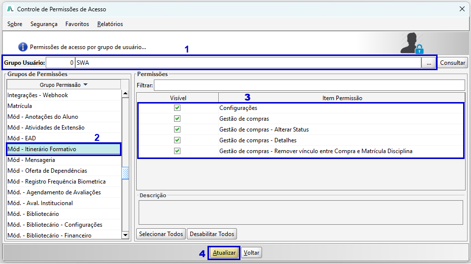 Para habilitar o acesso ao recurso de itinerário formativo aos usuários do sistema SWA.JACAD, é necessário liberar a permissão de acesso.