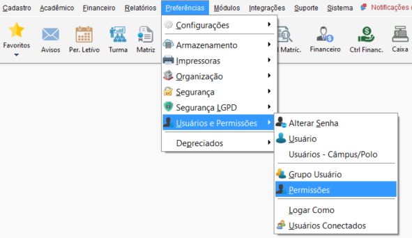 Os filtros disponíveis seguem o mesmo padrão das telas apresentadas anteriormente, com exceção do filtro Período Letivo, que é obrigatório para que o sistema apresente os registros correspondentes ao período informado.