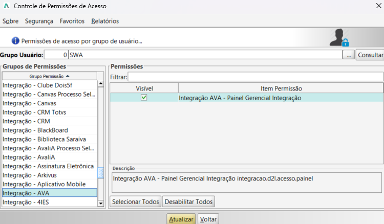 Opções: Ativar/Inativar: solicita a ativação ou inativação dos usuários selecionados na plataforma Canvas.