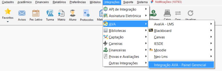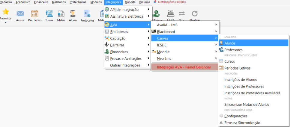 Acesse o menu Integrações, percorra até AVA, acesse Canvas e clique em Alunos.