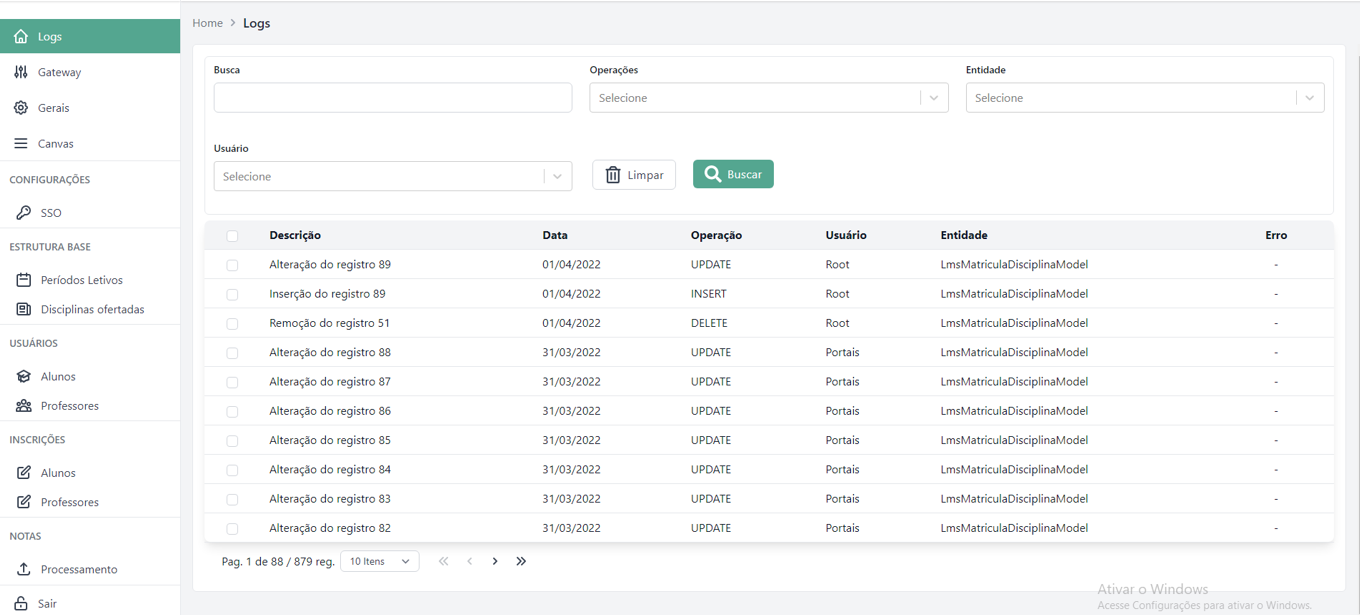 Essa tela permite obter a nota final registrada na plataforma Canvas LMS. Nela são listadas todas as inscrições de alunos, juntamente com suas respectivas notas finais existentes no LMS da organização selecionada.