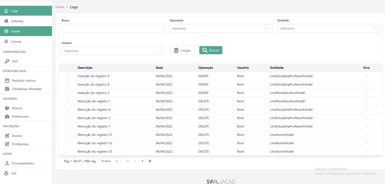 Opções: Remover Referência: solicita a remoção do registro do período letivo no sistema JACAD.