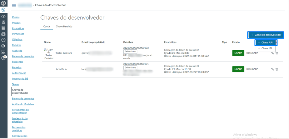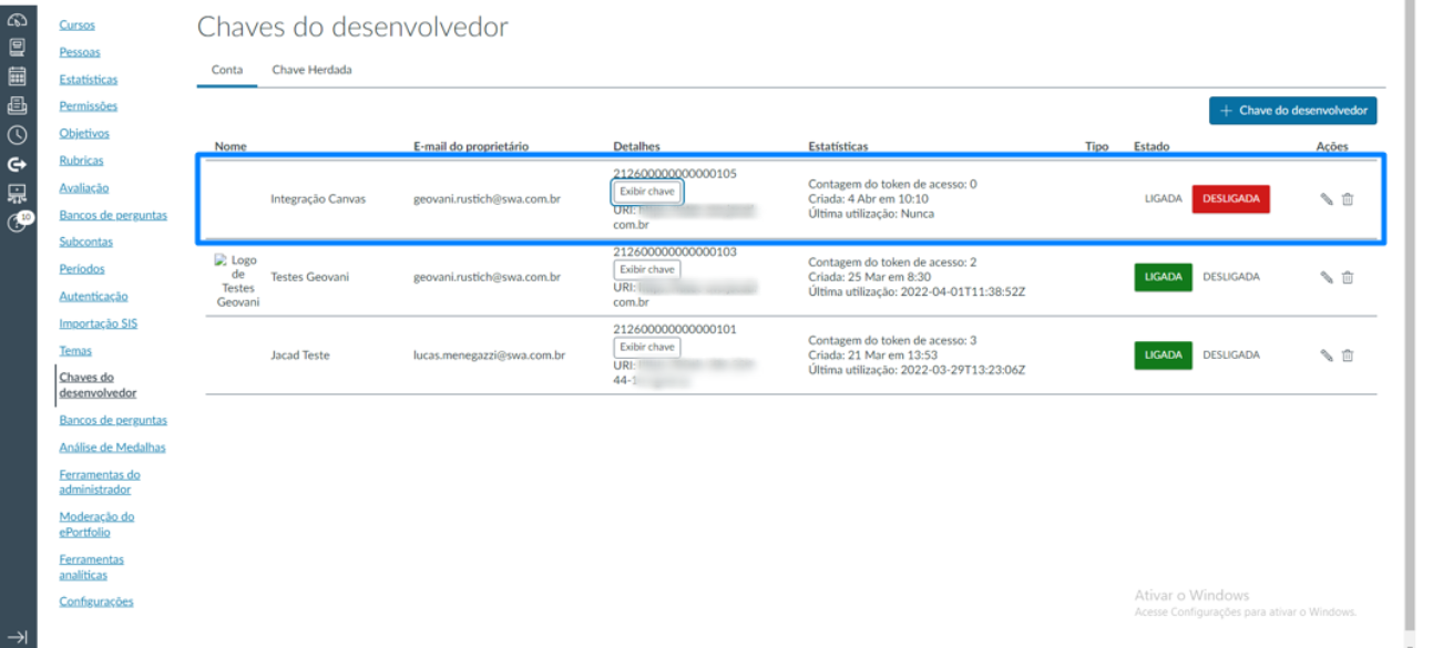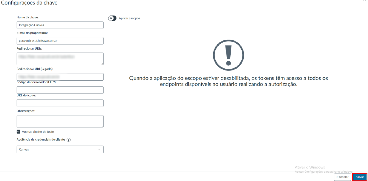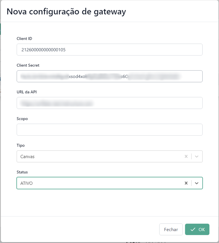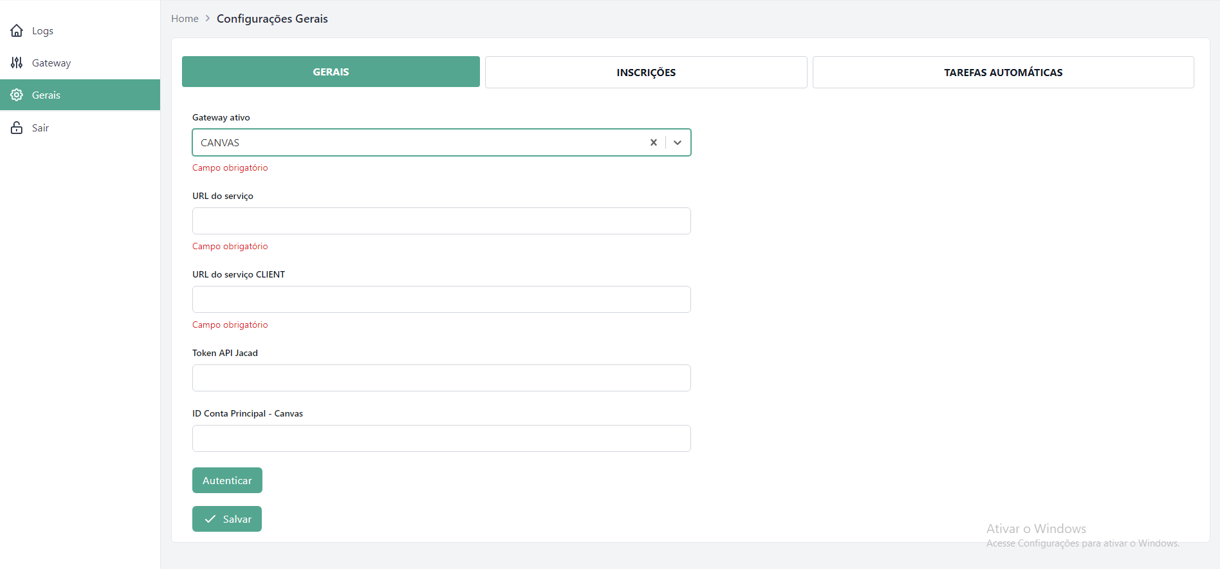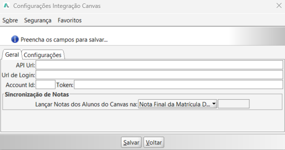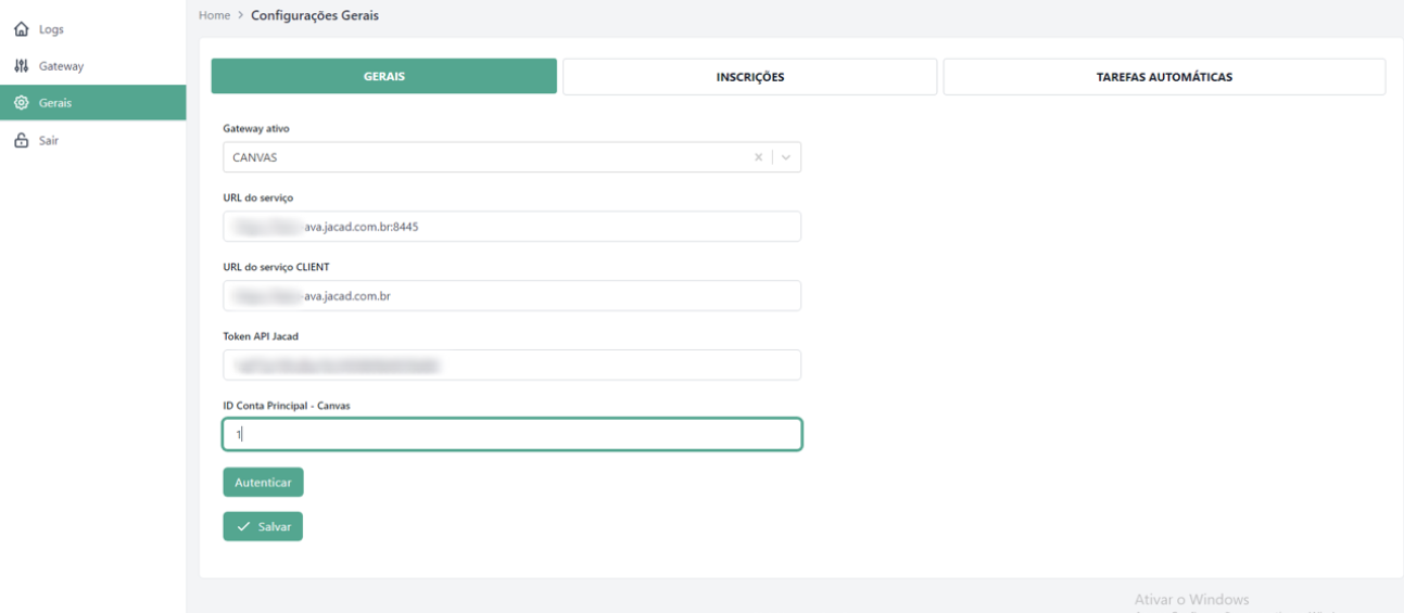 Nesta aba encontram-se os campos obrigatórios para estabelecer a conexão com o Canvas por meio de sua API.