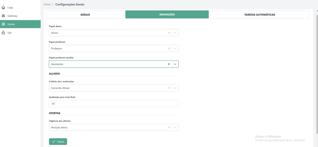Login Padrão do Aluno: Determina qual informação será usada como login do aluno ao criar ou atualizar o usuário no Canvas.
