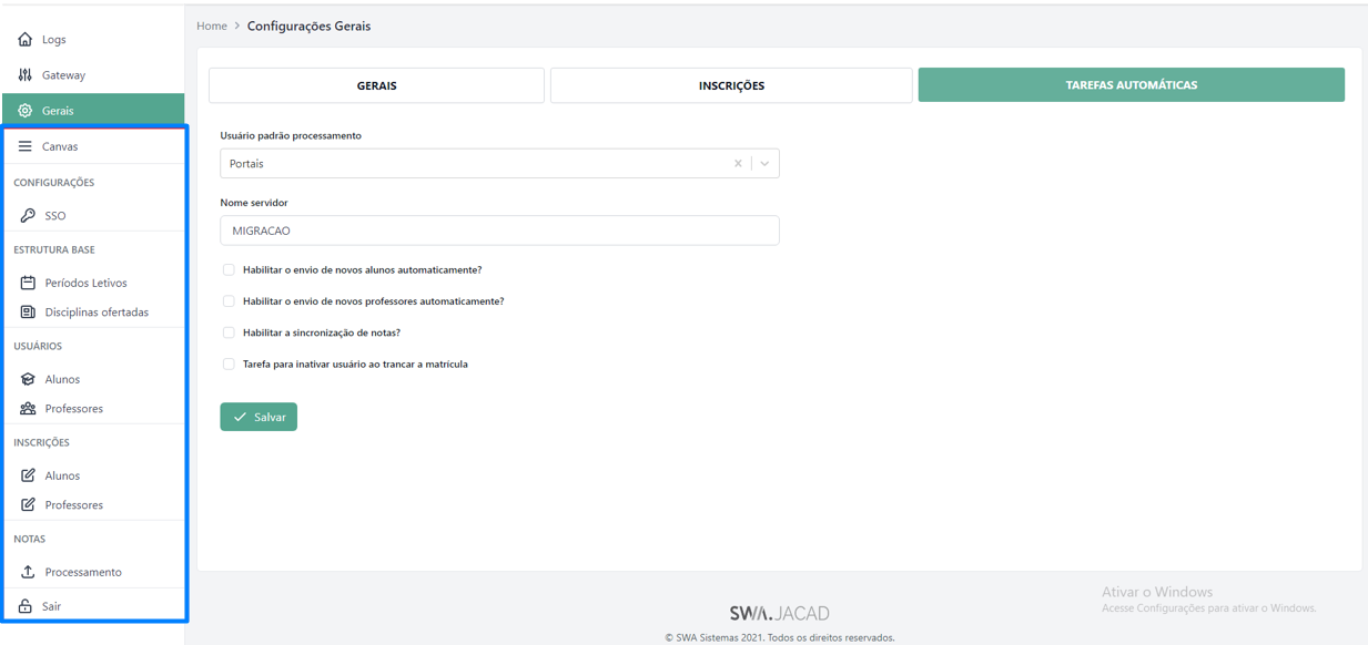 A aba Configurações reúne os parâmetros de padronização utilizados na sincronização entre o sistema acadêmico e o Canvas LMS, abrangendo regras de geração de login, busca de usuários e definição de senhas para alunos e professores, além do padrão de nomenclatura dos cursos a serem enviados ao Canvas.