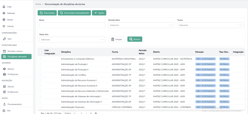 Sincronizar: realiza o envio ou atualização das disciplinas ofertadas para a plataforma Canvas.