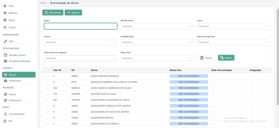 Sincronizar: envia os alunos selecionados para a plataforma Canvas, criando seus respectivos usuários.