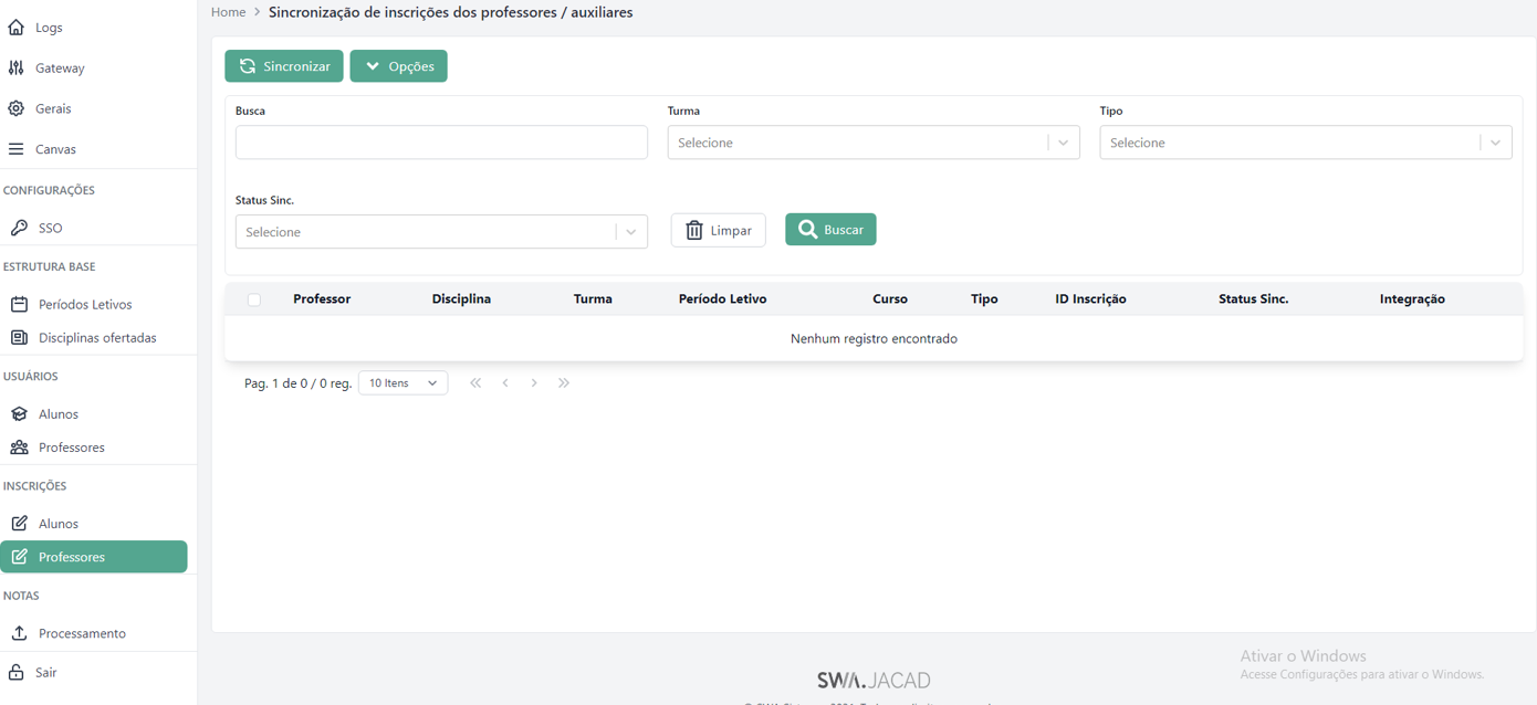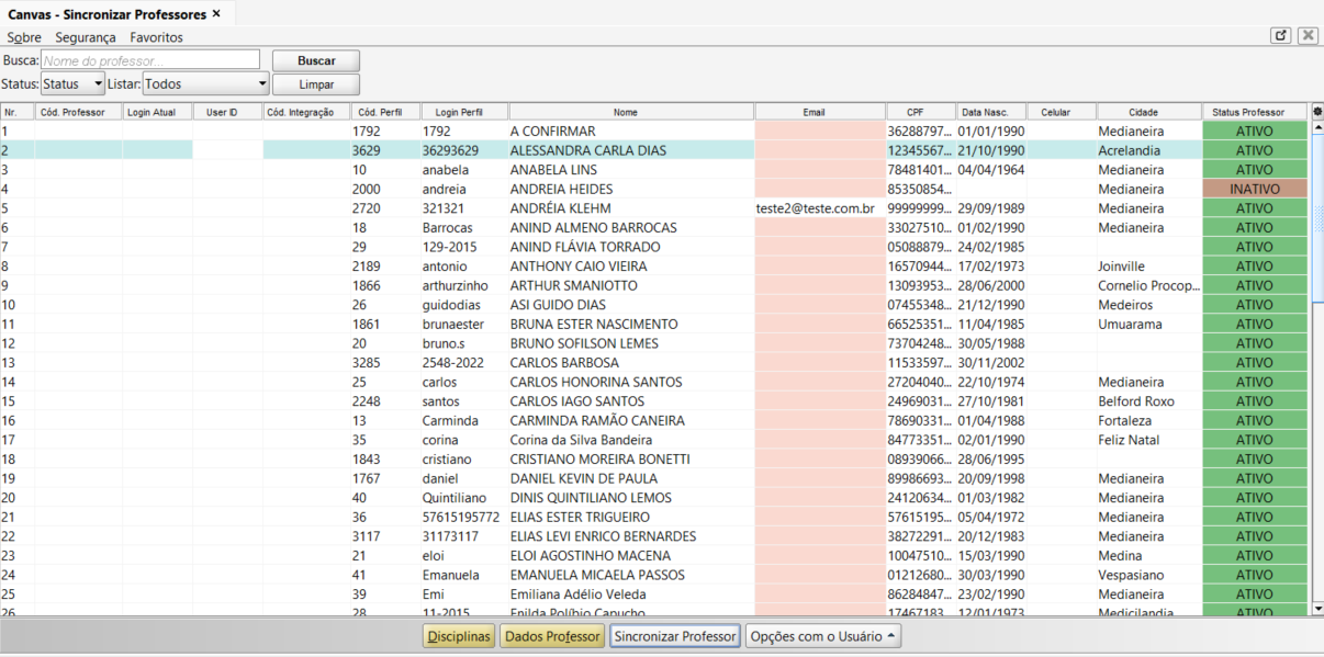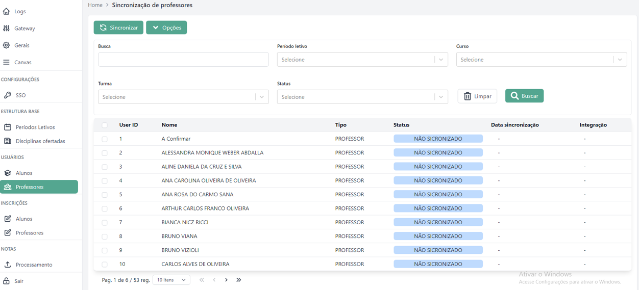 Sincronizar: envia os professores selecionados para a plataforma Canvas, criando seus usuários.