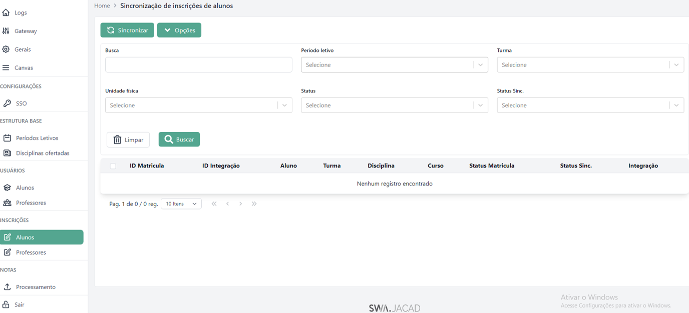 Sincronizar: realiza o envio da inscrição do aluno para a plataforma Canvas.