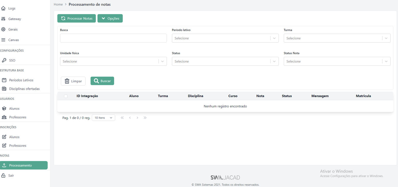 Processar Notas: realiza a importação das notas existentes na plataforma Canvas LMS para o JACAD. A avaliação que deverá receber a nota importada deve estar configurada previamente na tela de Configurações Gerais, no campo Avaliação para nota final.