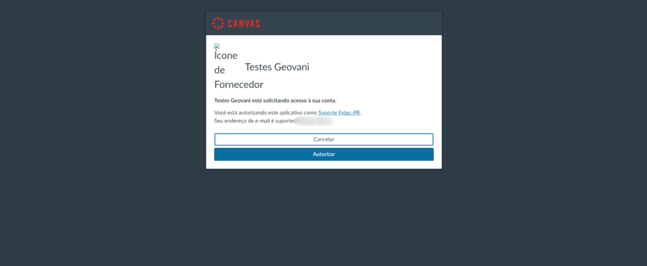 Após clicar em Autenticar, o sistema irá direcionar o usuário para a tela de solicitação de permissão no Canvas, onde será autorizada a utilização da Chave API cadastrada.
