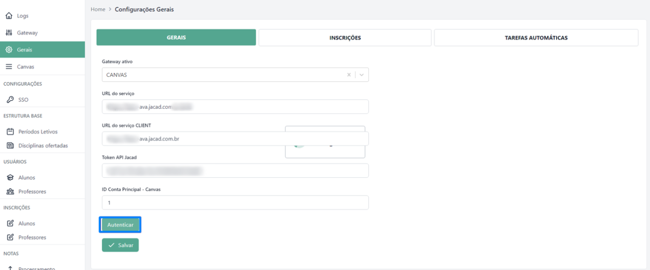 Após concluir o processo, clique no botão Autenticar para realizar a autenticação no Canvas e estabelecer a conexão entre o serviço do JACAD e o serviço do Canvas.