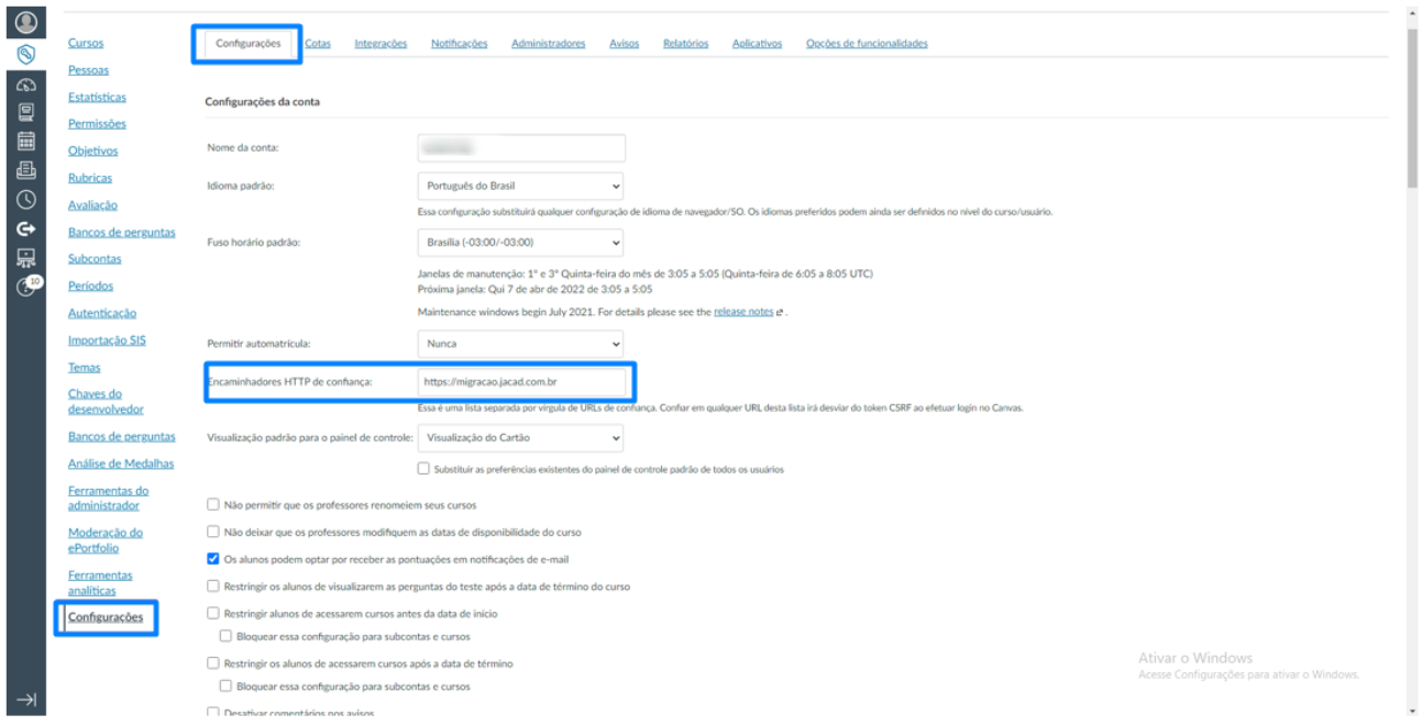 Na tela exibida, dentro do menu Configurações no Canvas LMS, localize o campo Encaminhadores HTTP de confiança. Nesse campo, deve ser adicionada a URL do JACAD — conforme destacado na imagem — garantindo que a plataforma reconheça o endereço como um encaminhador confiável para o funcionamento correto do SSO.