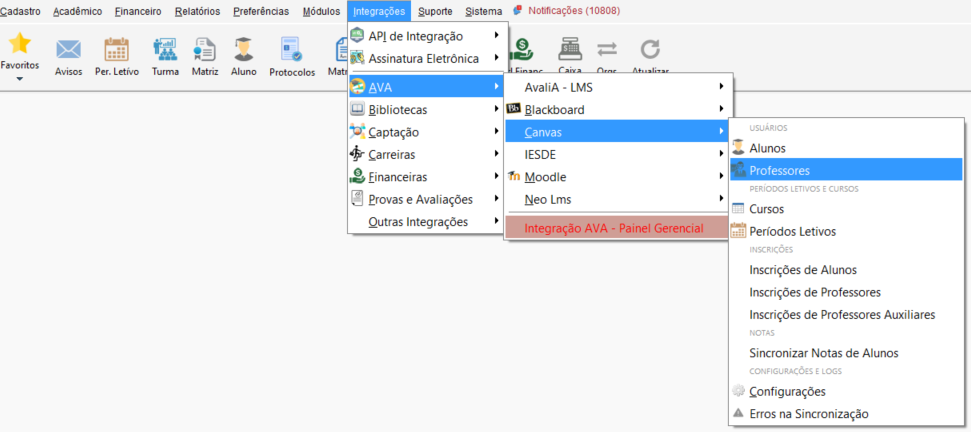 Acesse o menu Integrações, percorra até AVA, acesse Canvas e clique em Professores.