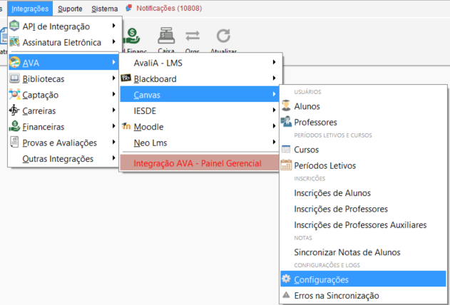Acesse o menu Integrações, percorra até AVA, acesse Canvas e clique em Configurações.
