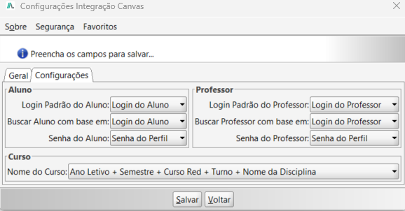 Deve coincidir com o padrão de login adotado para evitar duplicidade.Senha do Aluno: Determina a regra para a senha inicial dos alunos no Canvas.