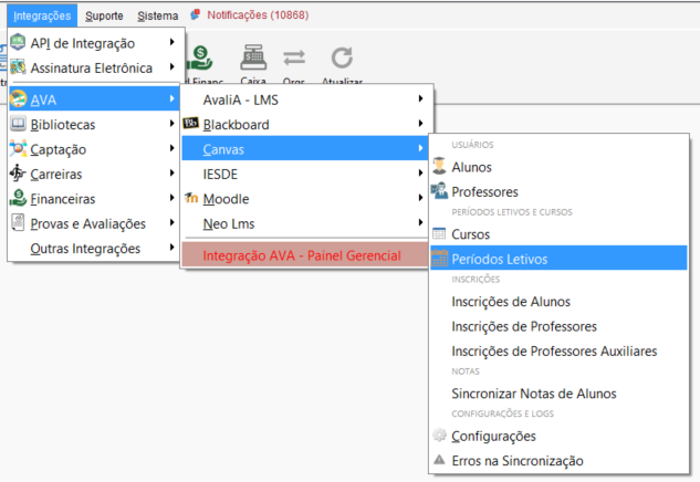 Sincronizar: executa o envio ou atualização dos dados dos períodos letivos selecionados para a plataforma Canvas.