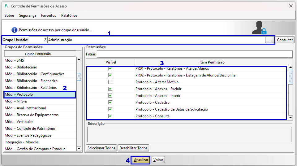PASSO 2: Na tela Controle de Permissões de Acesso, selecione um grupo de usuário. Na sequência na tabela Grupo de Permissões, selecione o item Mód. - Protocolo. A partir daí, será possível definir, de forma personalizada, quais funcionalidades estarão disponíveis para esse grupo de usuário.