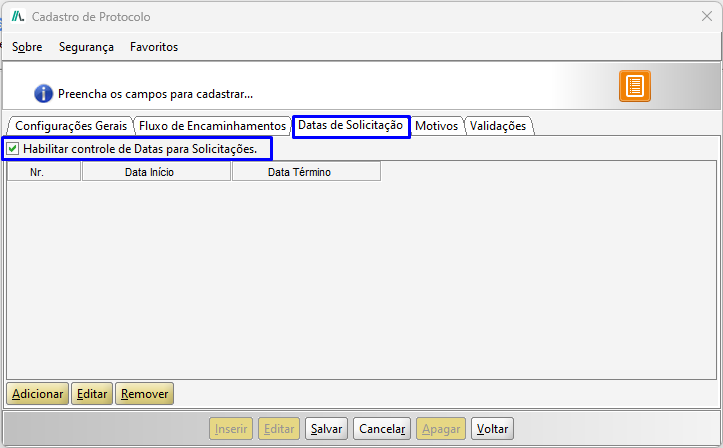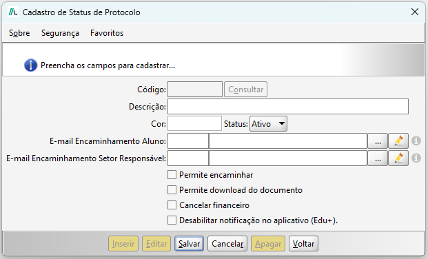 - Status Inicial: Status que será encaminhado o protocolo, caso o mesmo não possua um fluxo configurado no Cadastro de Protocolo.