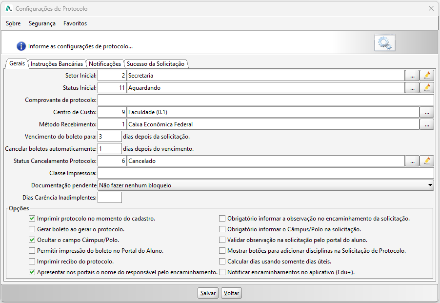 - Obrigatório informar o câmpus/polo na solicitação: Se marcar essa opção será obrigatório informar o câmpus/polo ao realizar a solicitação de protocolo no portal do aluno e no Sistema JACAD.