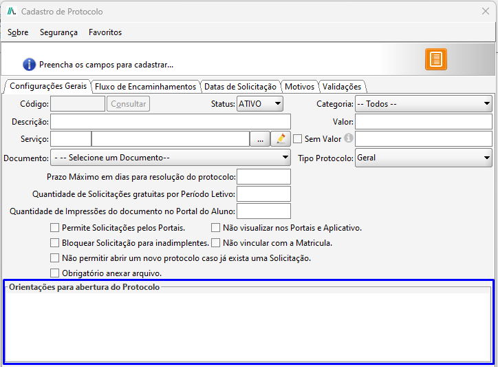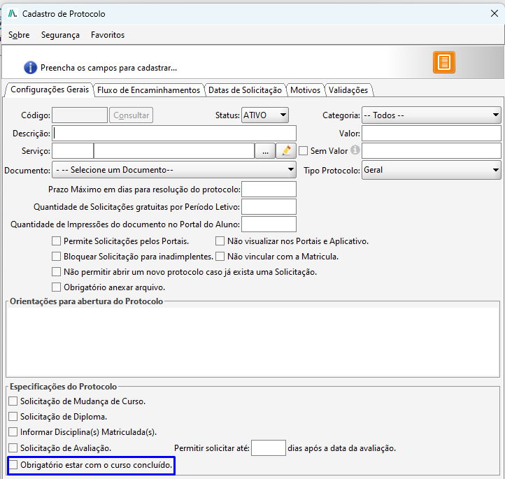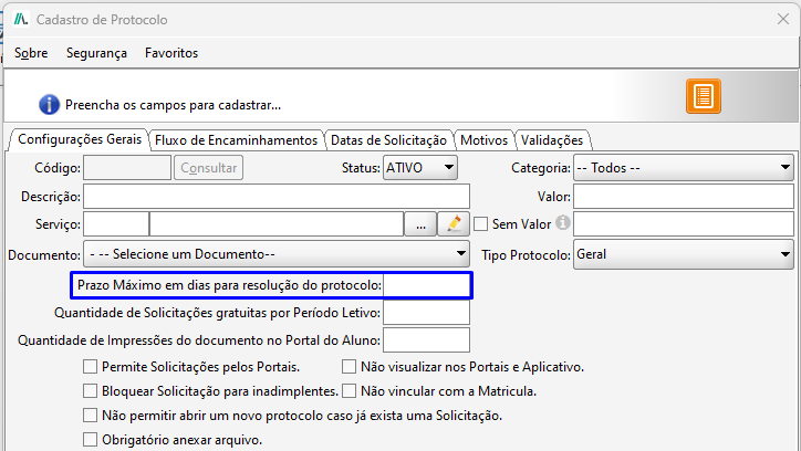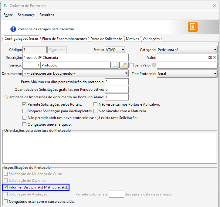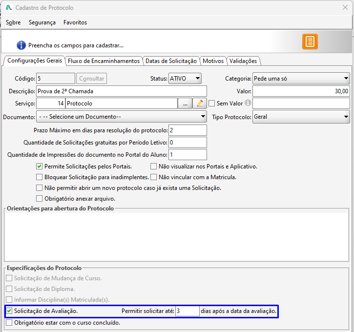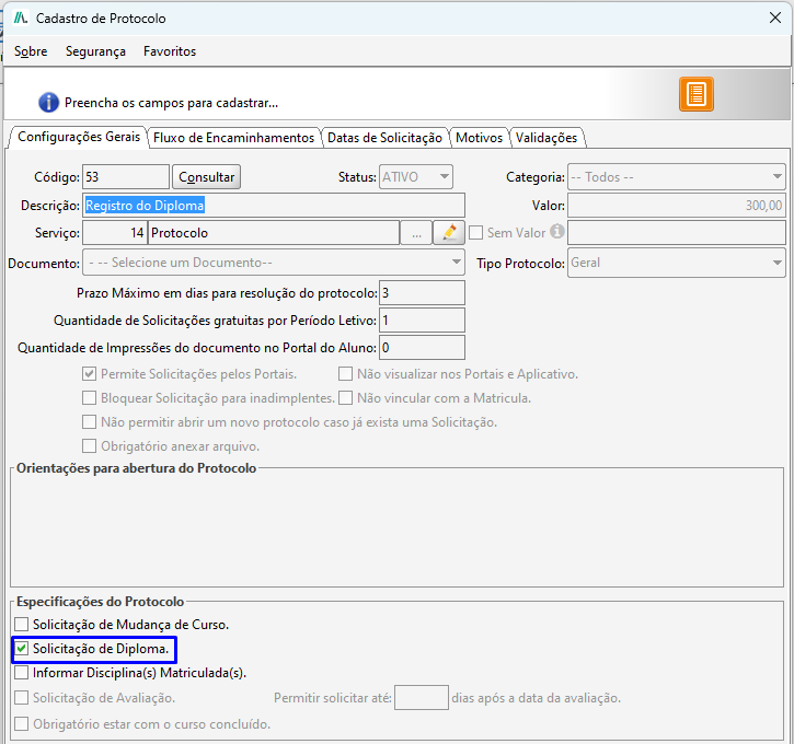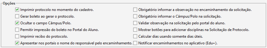 - Validar observação na solicitação pelo portal do aluno: Se marcada essa opção é obrigatório o aluno informar uma observação ao realizar a solicitação de protocolo, caso desmarcada será opcional.