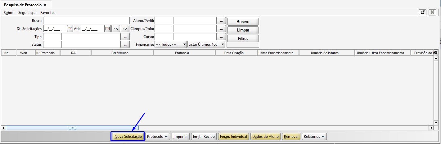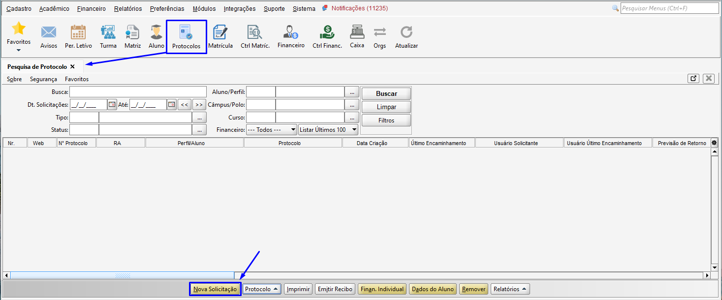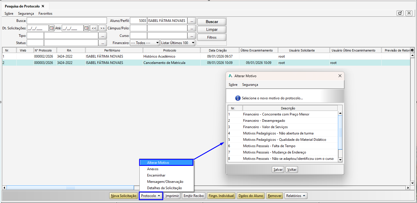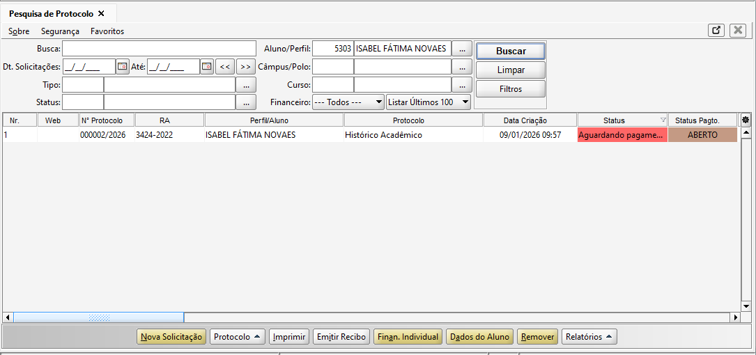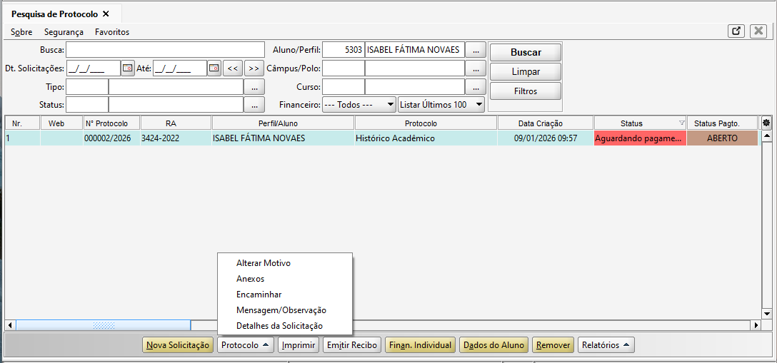 Na tela de Pesquisa de Protocolo, na barra inferior, estão disponíveis dois atalhos um para o financeiro individual do aluno e outro que leva a tela de dados do aluno.