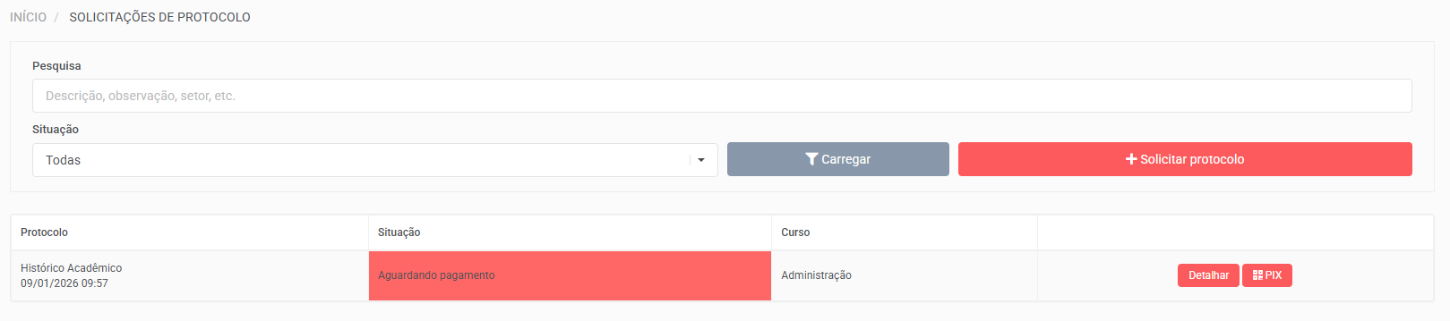 Ao acessar a tela, o aluno pode visualizar os protocolos já enviados e também realizar a solicitação de um novo protocolo.