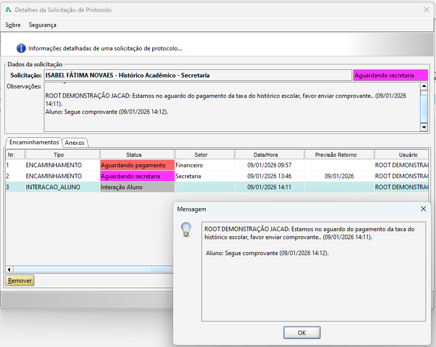 Na sequência, será aberta a tela de Detalhes da Solicitação de Protocolo, e ao clicar duas vezes em um registro de Mensagem ou Interação Aluno, será aberto um Pop-up, mostrando a mensagem, a data e o usuário que inseriu a mensagem.