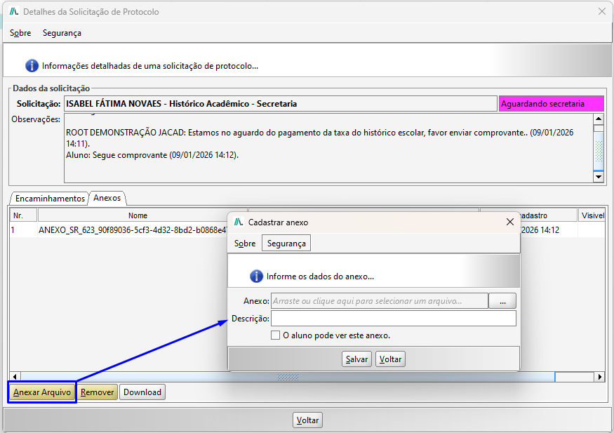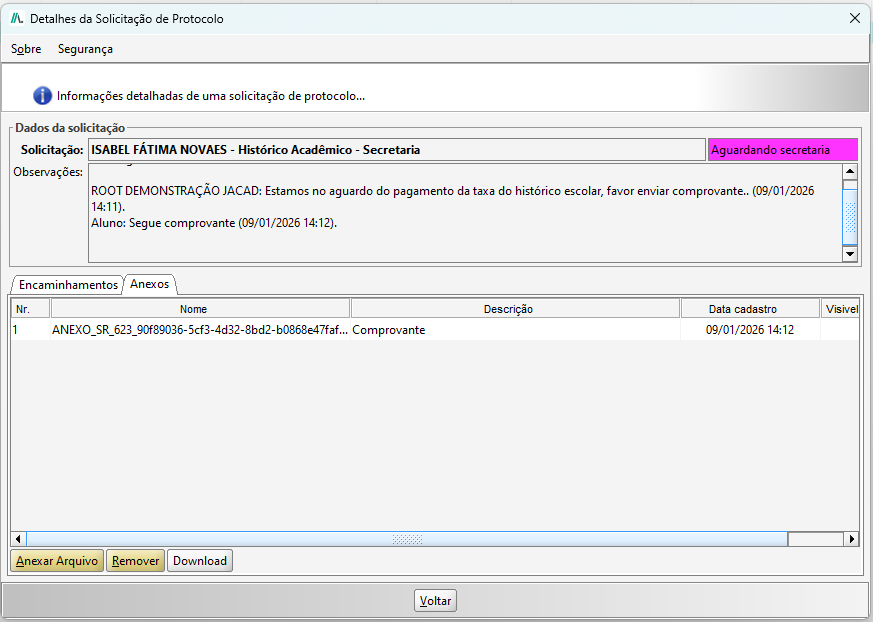 Essa resposta e anexo também são apresentados no JACAD, nos detalhes da solicitação.