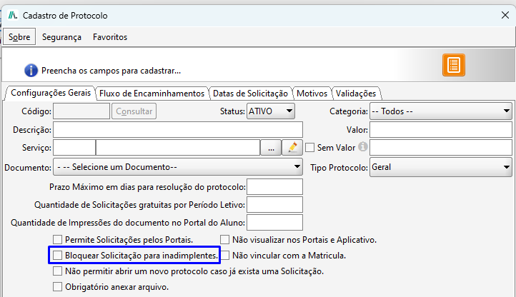 Lembrando que na Tela de Cadastro de Protocolo é necessário estar marcada a opção de Bloquear solicitação para inadimplentes.