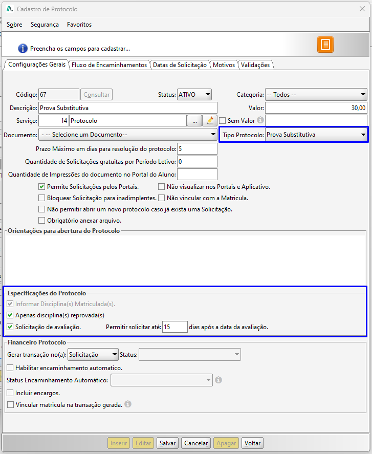 - Permite Download do Documento: Permite que o documento associado ao protocolo possa ser baixado pelo Portal do Aluno e pelo sistema.