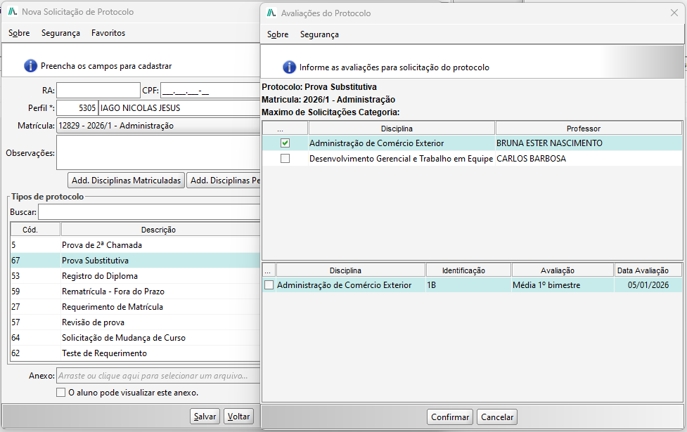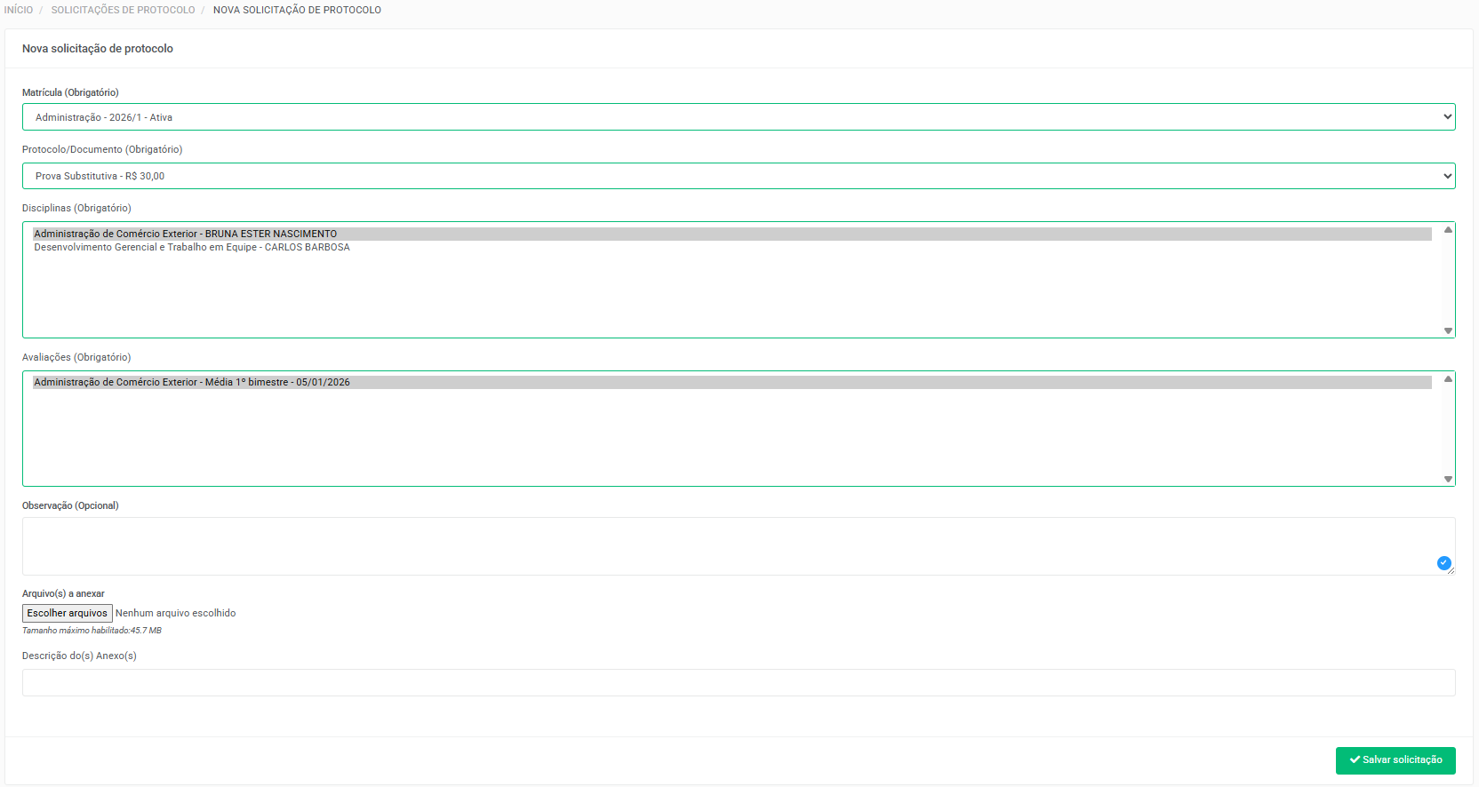 - Não Permitir solicitar protocolo para a mesma disciplina: o aluno só poderá solicitar um protocolo de cada disciplina.