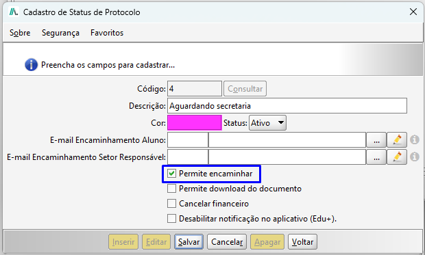 - Permite Encaminhar: Todos os status que tramitam o protocolo na instituição devem estar com essa opção marcada, caso contrário indica que é um tipo de status que conclui o fluxo.
