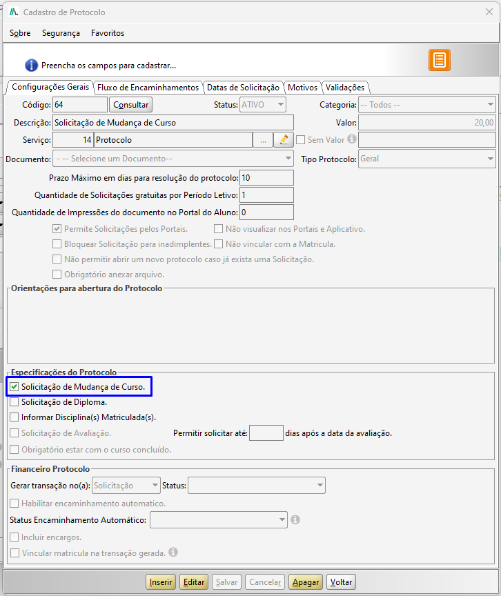 - Máximo Solicitações: Indica a quantidade máxima de vezes que um aluno pode solicitar um protocolo com essa categoria.