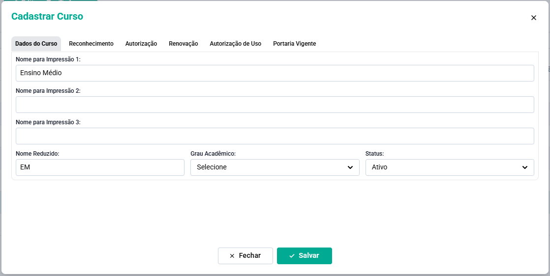 Será aberta a tela Cadastrar Curso, e na aba Dados do Curso, temos os seguintes campos para preenchimento:Nome de Impressão: é utilizado nos documentos em que o nome do curso deve ser impresso. Há ainda mais dois campos de nomes para impressão caso haja necessidade de utilizar um nome diferenciado para outros tipos de documento. Ex: No Histórico Escolar utilizar o Nome para Impressão e no Certificado o Nome para Impressão 2;