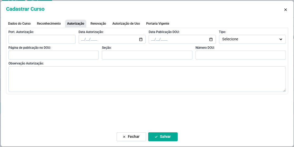 Preencha os campos com os dados de autorização do curso.