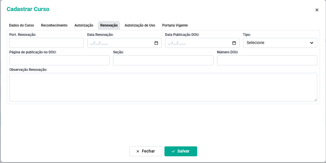 Preencha com os dados de renovação do curso.