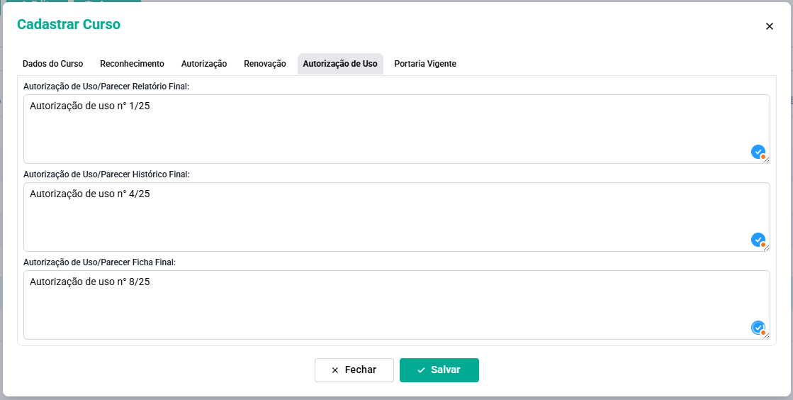 Autorização de Uso/Parecer Ficha Individual: A informação cadastrada nesse campo será informada no relatório A53 - Ficha Individual - Fundamental/Médio.