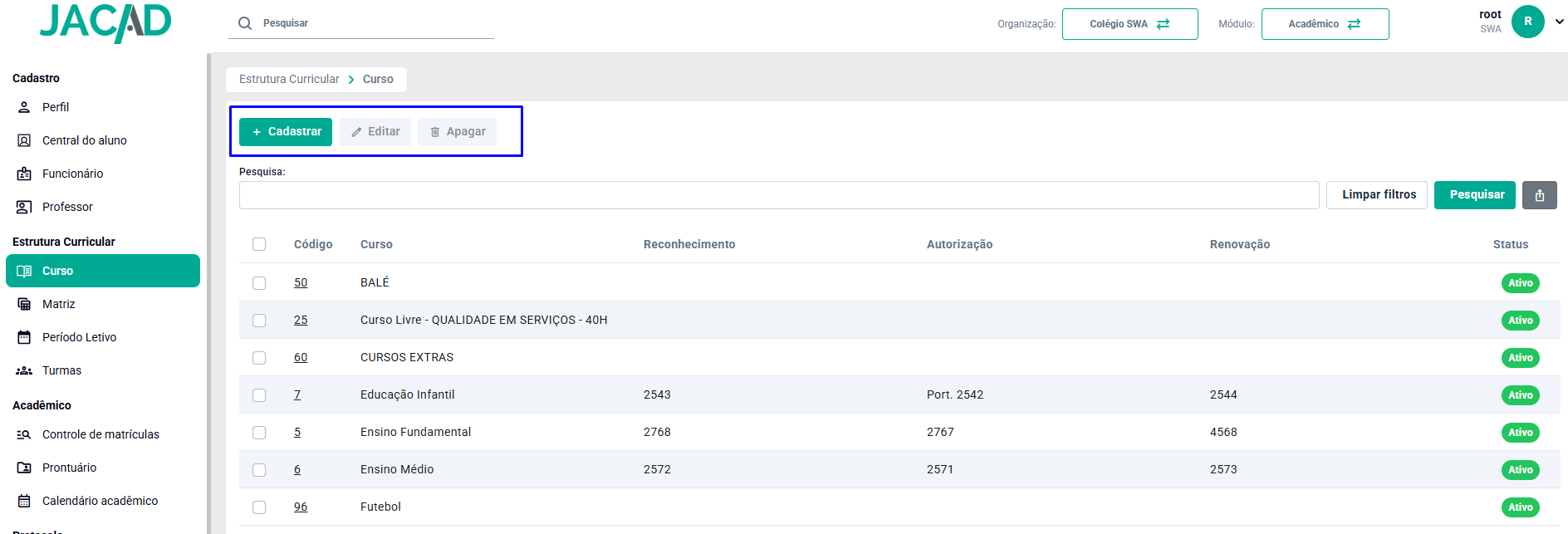 Na parte superior da tela de Curso, estão disponíveis as seguintes opções:Cadastrar: permite incluir um novo curso no sistema.