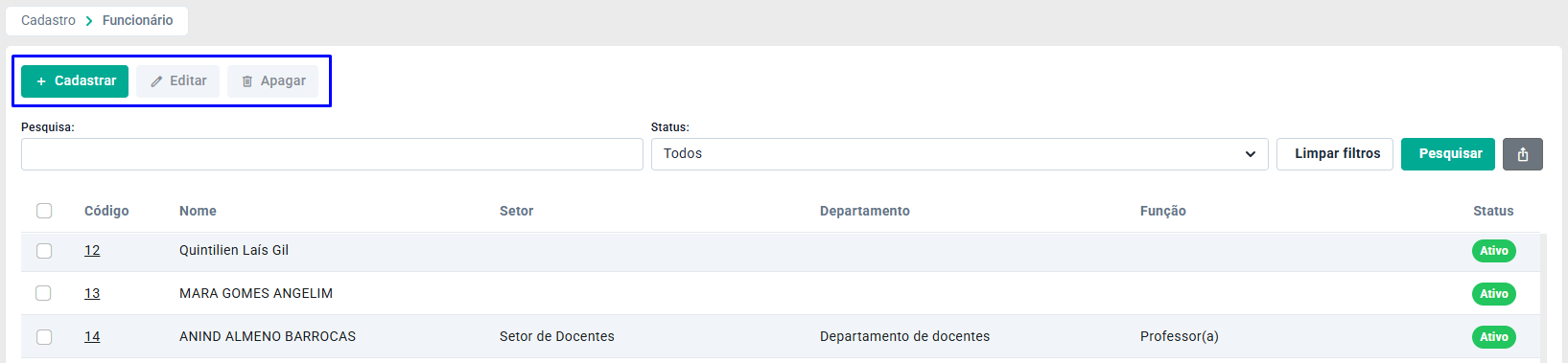 Apagar: Exclui o funcionário do sistema. Caso o funcionário já possua vínculos, recomenda-se utilizar a opção de inativar em vez de apagar o cadastro.