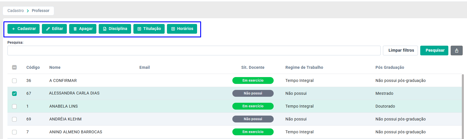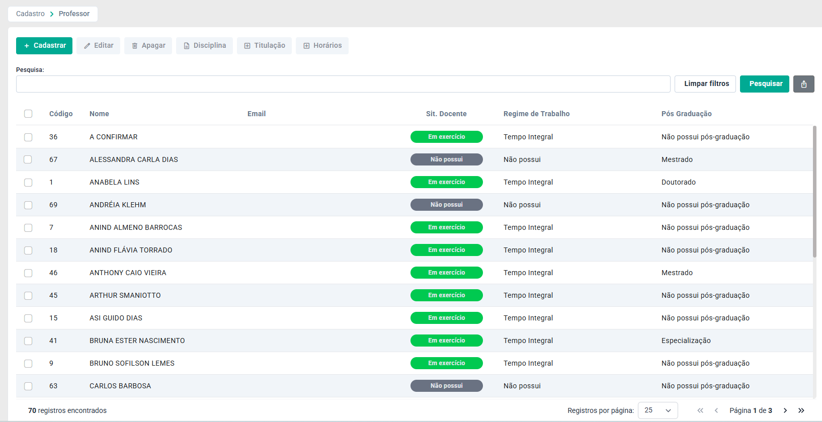 Na parte central da tela é exibida a lista de professores cadastrados, com informações organizadas em colunas, como Código, Nome, E-mail, Situação Docente, Regime de Trabalho e Pós Graduação.
