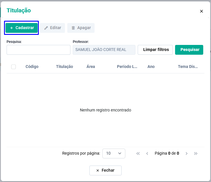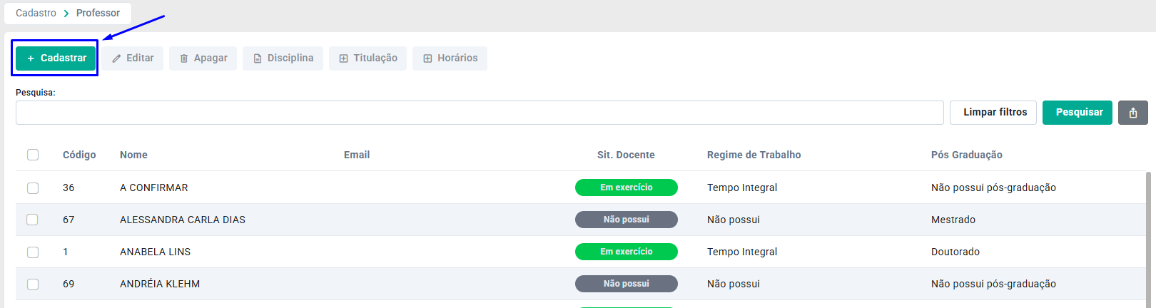 Para realizar o cadastro de um novo professor no sistema, clique no botão Cadastrar.