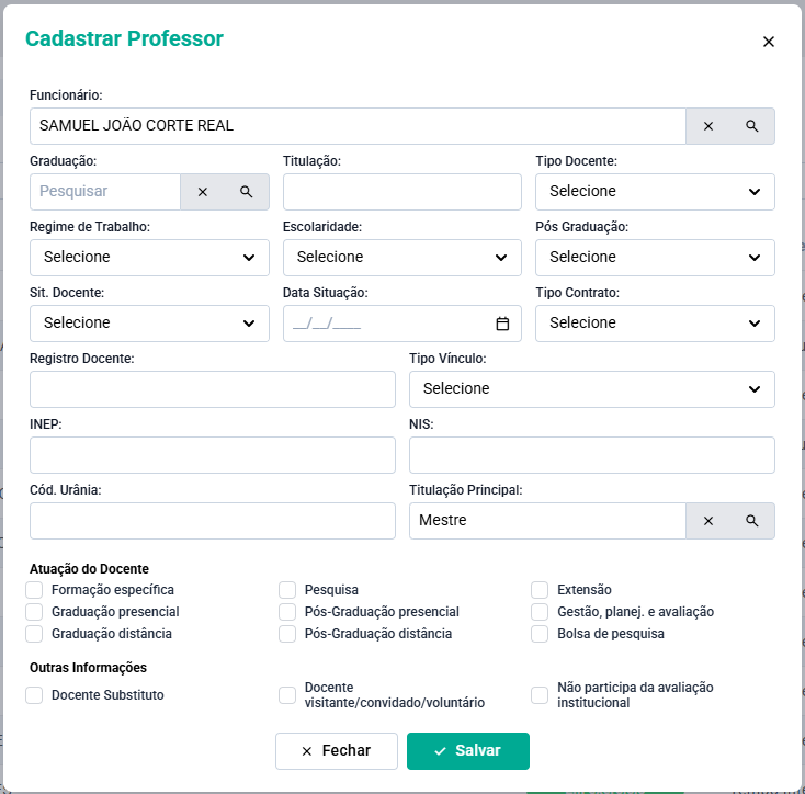 Na tela de Cadastro de Professor, preencha os campos de funcionário e titulação principal que são obrigatórios para preenchimento. Ainda é possível inserir outras informações para um registro mais completo do professor. Inclui campos importantes como Graduação, Titulação, Tipo Docente, Regime de Trabalho, Escolaridade, Pós-graduação, Situação do Docente, Data da Situação, Tipo de Contrato, entre outros. Na seção Atuação Docente, devem ser informadas as áreas em que o professor está atuando dentro da instituição.