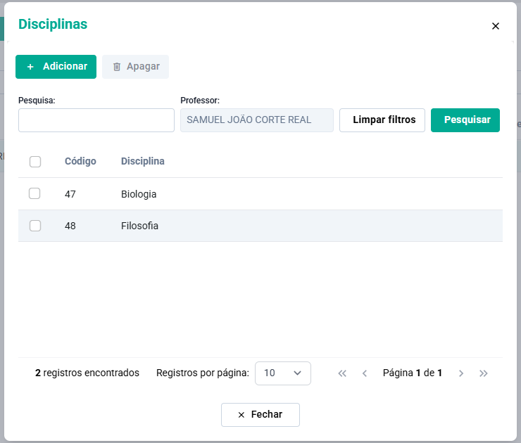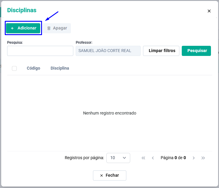 OBSERVAÇÃO: Ainda é possível apagar as disciplinas vinculadas ao cadastro do professor, selecionando a disciplina desejada e clicando no botão Apagar.