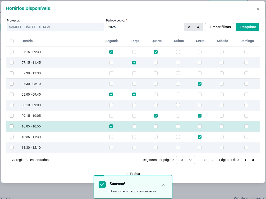 Na tela de Horários Disponíveis, informe o período letivo e clique no botão Pesquisar. Assim, é possível marcar os horários que o professor tem disponível para ministrar aulas. Ao selecionar um horário será salvo automaticamente o registro.