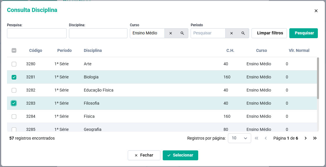 Realize a consulta dos dados e selecione as disciplinas desejadas e clique no botão Selecionar.