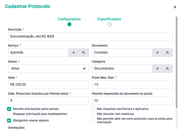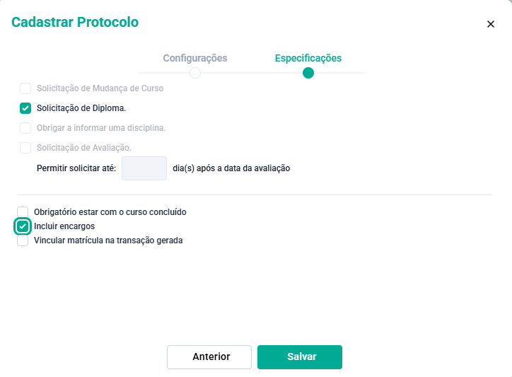 Validar observação na solicitação pelo portal do aluno: Se marcada essa opção é obrigatório o aluno informar uma observação ao realizar a solicitação de protocolo, caso desmarcada será opcional;