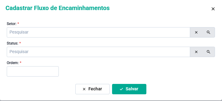 - Ordem: Informar a ordem dos fluxos. Ordem 1 é onde o protocolo é aberto, ordem dois o próximo setor que irá passar e assim por diante.