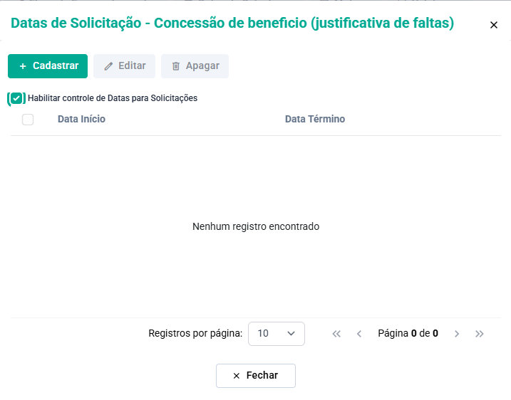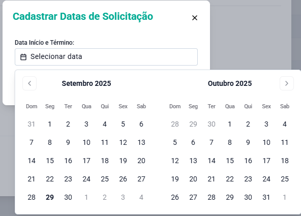 Após isso deverá ser cadastrado pelo menos um intervalo de datas para que sejam realizadas as solicitações.